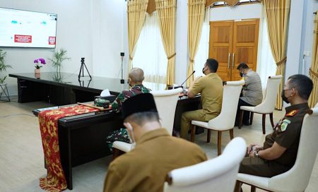 Wali Kota Medan, Muhammad Bobby Afif Nasution,SE.,MM bersama unsur Forkopimda Kota Medan mengikuti rapat koordinasi penegakan disiplin protokol kesehatan dan penanganan covid-19 secara virtual dari ruang rapat Rumah Dinas Wali Kota Medan, Senin (3/05).