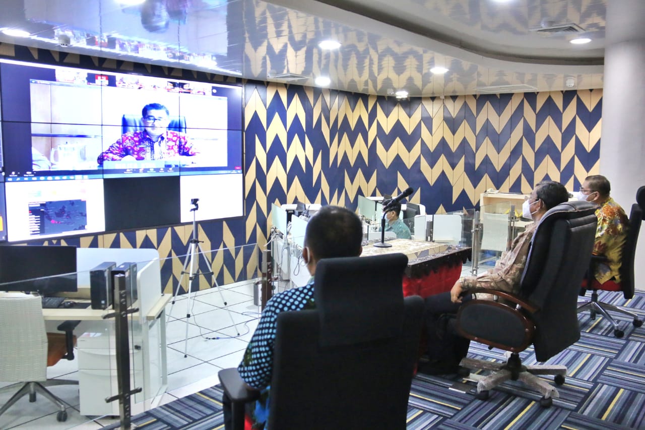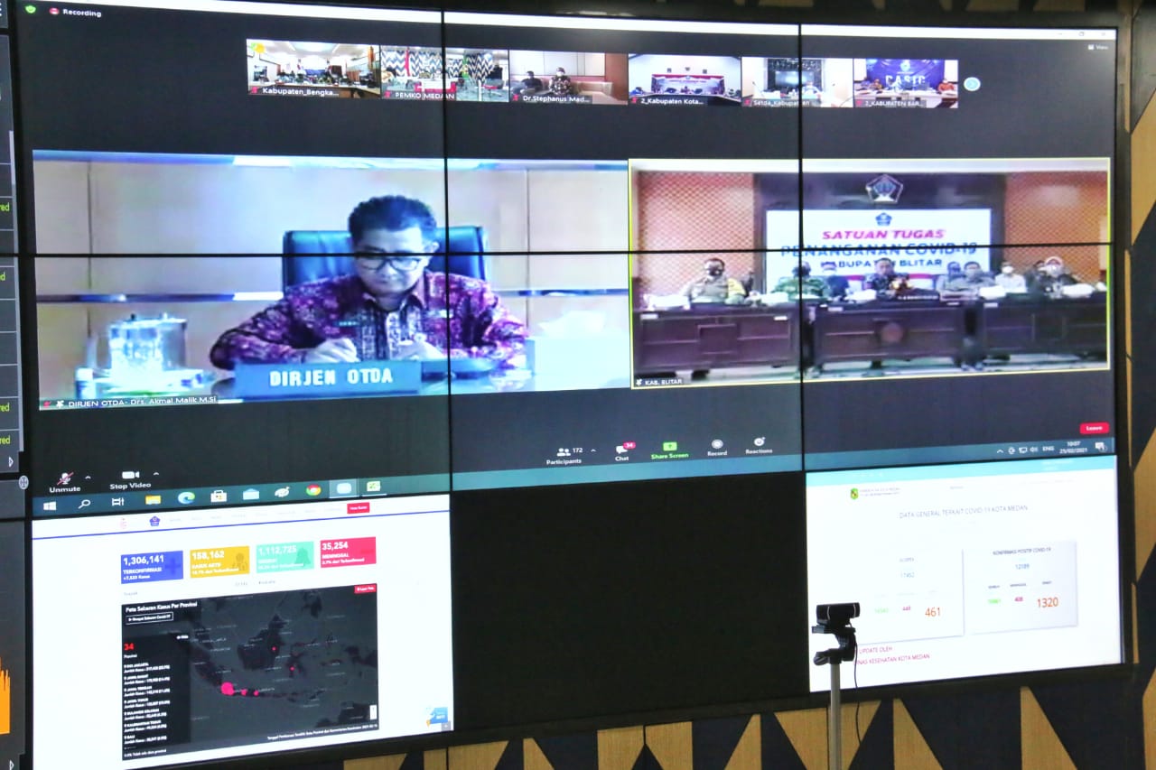 Pelaksana Harian (Plh) Wali Kota Medan, Ir. Wiriya Alrahman,MM mengikuti rapat koordinasi (rakor) pemantapan pelaksanaan pilkada Wali Kota dan Wakil Wali Kota hasil pilkada serentak tahun 2020 melalui sambungan vidcon dari ruang Command Center Kantor Wali Kota Medan, Kamis (25/02).
