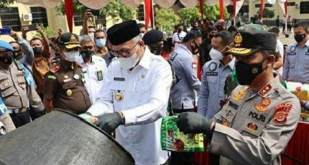 ” Kita sadari, Aceh terancam jika pelaku bisnis narkoba tidak ditindak tegas. Mungkin 15 tahun ke depan, generasi muda Aceh akan rusak fisik dan mental,” sebut Gubernur Nova. Kegiatan itu turut diwarnai penyerahan penghargaan oleh Kapolda Aceh dan Gubernur Aceh kepada personel Polri yang berhasil mengungkap peredaran narkoba sabu di Aceh. Selain itu, juga dilakukan penandatangan berita acara pemusnahan barang bukti sabu tersebut. Barang bukti sabu itu sebelum dimusnahkan diuji sampel keaslian narkoba oleh BPOM Banda Aceh dengan alat tes narkoba. Kegiatan juga dihadiri Wakapolda Aceh dan sejumlah Pejabat Utama Polda Aceh lainnya.(@ndi/dir)