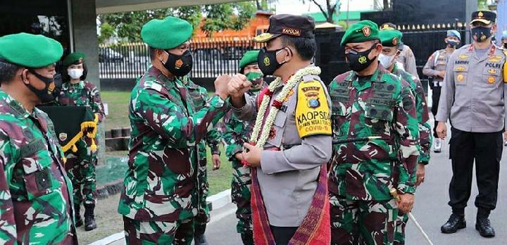 MEDAN – Kapolda Sumatera Utara Irjen Pol R. Z. Panca Putra S. bersama Ketua Bhayangkari Daerah Sumut Rita Panca Putra, menerima penyambutan tugas dari Kodam I/BB dan jajaran, Senin (15/3). Bertempat di Makodam I/BB. Pangdam I/BB Mayjen TNI Hasanuddin bersama Ketua Persit KCK PD I/BB Dessy Hasanuddin menyambut langsung kedatangan Kapolda Sumut dan Ketua Bhayangkari bersama seluruh PJU Poldasu. Dalam penyambutan tugas itu, Pangdam dan Ketua Persit KCK I/BB memberikan ulos serta mengalungi bunga kepada Kapolda Sumut bersama Ketua Bhayangkari Daerah Sumut. Selanjutnya, Kapolda Sumut pun diberikan kesempatan mengambil apel serta mendengar laporan dari prajurit.