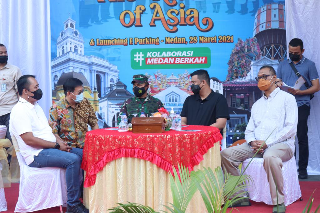 Wali Kota Medan, Muhammad Bobby Afif Nasution, S.E., M.M. melakukan soft launching Kesawan City Walk dan E-Parking, Minggu (28/3) petang di Jalan Ahmad Yani Medan. Perhelatan berlangsung di depan bangunan bersejarah, Rumah Tjong A Fie ini, tetap meriah, kendati protokol kesehatan diterapkan secara ketat.