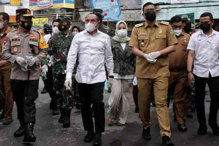 Wali Kota Medan Muhammad Bobby Afif Nasution SE MM bersama Gubernur Sumut Edy Rahmayadi dan Unsur Forkopimda Sumut membagikan ribuan masker dan hand sanitizer gratis untuk masyarakat di Pasar Petisah, Selasa (30/1). Pembagian Masker ini merupakan langkah preventif dilakukan untuk menekan penyebaran Virus Covid-19 yang masih tinggi sampai saat ini.