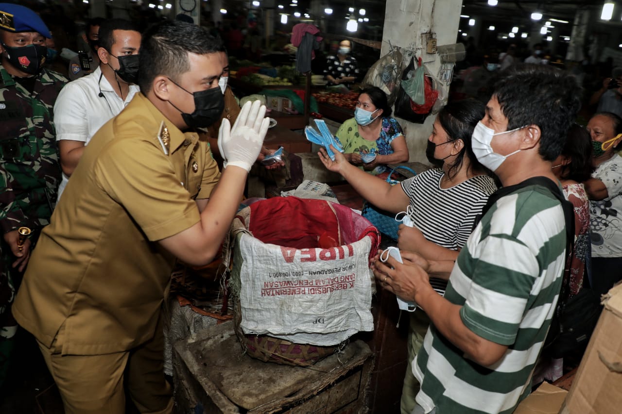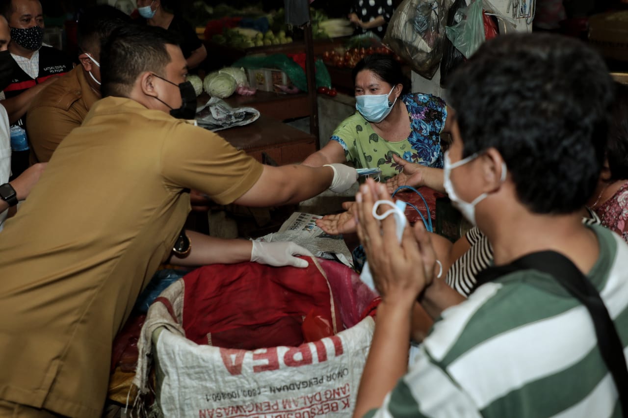 Wali Kota Medan Muhammad Bobby Afif Nasution SE MM bersama Gubernur Sumut Edy Rahmayadi dan Unsur Forkopimda Sumut membagikan ribuan masker dan hand sanitizer gratis untuk masyarakat di Pasar Petisah, Selasa (30/1). Pembagian Masker ini merupakan langkah preventif dilakukan untuk menekan penyebaran Virus Covid-19 yang masih tinggi sampai saat ini.