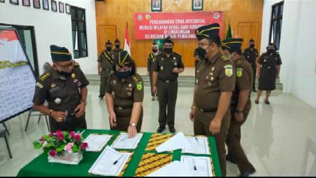 P. SIANTAR, – Deklarasi Pembangunan Zona Integritas (ZI) menuju Wilayah Bebas Korupsi dan Wilayah Birokrasi Bersih Melayani (WBK/WBBM) di lingkungan Kejaksaan Tinggi Sumut berlangsung secara virtual, Senin (5/4/2021). Kejari Pematangsiantar juga turut serta dalam deklarasi tersebut dan turut melakukan Penandatanganan Pakta Integritas dan Penandatanganan Komitmen Bersama. Penandatangan Pakta Integritas dan Komitmen bersama diawali dengan menyanyikan lagu Indonesia Raya berlangsung di ruang aula kantor Kejari Siantar dihadiri Kajari Siantar Agustinus Wijono Dososeputro dan para Kasi dengan agenda mendengarkan sambutan dan pembacaan deklarasi Pakta Integritas oleh Kajatisu Ida Bagus Nyoman Wiswantanu.