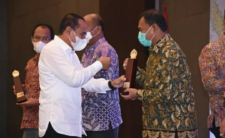 MEDAN | Kabupaten Deliserdang berhasil meraih Terbaik 1 Penghargaan Pembangunan Daerah (PPD) Tahun 2021 untuk Kategori Kabupaten Tingkat Provinsi Sumatera Utara, Penghargaan berupa Trophy tersebut langsung diberikan Gubernur Sumut H. Edy Rahmayadi kepada Bupati Deli Serdang H. Ashari Tambunan pada saat membuka Musyawarah Perencanaan Pembangunan (Musrenbang) penyusunan Rencana Kerja Pemerintah Daerah (RKPD) Provinsi Sumatera Utara Tahun 2022 di Hotel Santika Diandra, Kamis (8/4/2021). Gubernur Sumatera Utara H. Edy Rahmayadi mengucapkan selamat kepada Kabupaten/kota penerima penghargaan. Kepada Kabupaten / Kota se-Sumut, Gubernur mengajak untuk membangun daerah yang lebih baik lagi dengan memperhatikan masyarakat yang saat ini dalam kondisi memprihatinkan ditengah pandemi Covid-19. Pandemi Covid-19 yang melanda dunia, kata Gubernur, telah memengaruhi sendi kehidupan masyarakat, terutama pertumbuhan ekonomi yang mengalami kontraksi di semua sektor. Untuk itu, Musrenbang kali ini mengedepankan rencana kerja pembangunan daerah (RKPD) sebagai upaya memulihkan ekonomi dan kehidupan masyarakat.