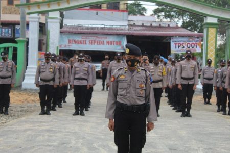 Tribratanewspolreslabuhanbatu – Kapolres Labuhanbatu AKBP DENI KURNIAWAN, SI.K., M.H. Pimpin Apel Gelar Pasukan, dan Pergeseran Pasukan serta Patroli / show off force R2, R4 dan R6 Dinas Skala besar dalam rangka pengamanan Pemungutan Suara Ulang (PSU) di Kab. Labuhanbatu, Rabu 21 April 2021.