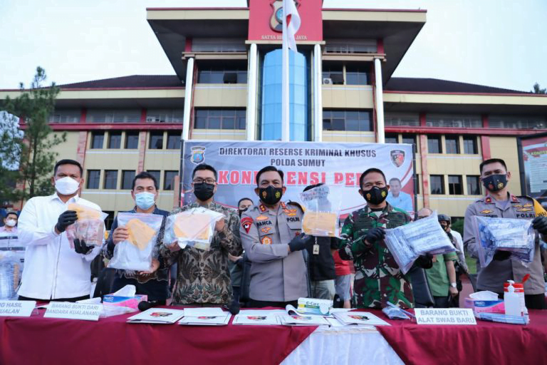 Konfrensi pers dihalaman poldasu yang langsung dipimpin kapolda sumut Irjen Pol.RZ Panca Putra simanjuntak.Msi dan didampingi oleh pangdam I/Bukit Barisan mayjen TNI Hasaninddin S,IP,MM menjelaskan.”dari hasil penyidikan yang dilakukan,ke 5 pelaku ditetapkan sebagain tersangka.modus pelaku dengan mendaur stick swab tes antigen yang telah digunakan dengan cara mencucinya untuk digunakan kembali dibandara.Dalam sehari stick daur ulang dapat digunakan 100 sampai 150 orang masyarakat yang melakukan penerbangan.Seharusnya stick tersebut dipatahkan setelah digunakan,tapi dibersihkan dan dikemas kembali untuk digunakan,kasus nya masih kita kembangkan”.uangkap nya.