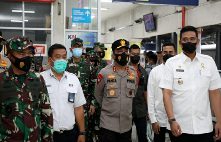 MEDAN – Kapolda Sumut Irjen Pol RZ Panca Putra Simanjuntak bersama Pangdam I/BB Mayjen TNI Hasanuddin, meninjau penerapan protokol kesehatan penumpang kereta api yang berangkat dari menuju daerah lainnya di stasiun kereta api. Kapolda Sumut, Pangdam I/BB dan Wali Kota Medan Bobby Nasution turut mengecek surat kesehatan para penumpang yang hendak berangkat menggunakan kereta api, Kamis (6/5/2021). “Sudah di swab bu.