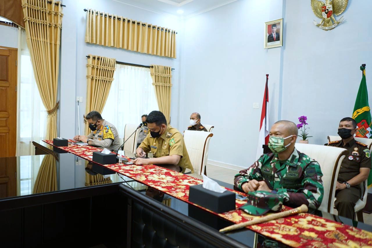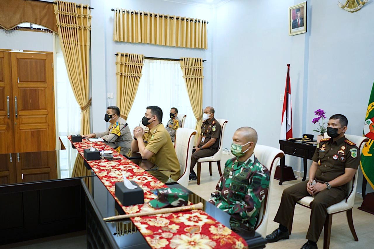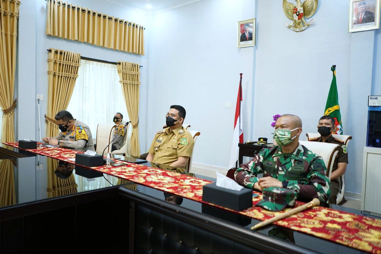Wali Kota Medan, Muhammad Bobby Afif Nasution,SE.,MM bersama unsur Forkopimda Kota Medan mengikuti rapat koordinasi penegakan disiplin protokol kesehatan dan penanganan covid-19 secara virtual dari ruang rapat Rumah Dinas Wali Kota Medan, Senin (3/05).
