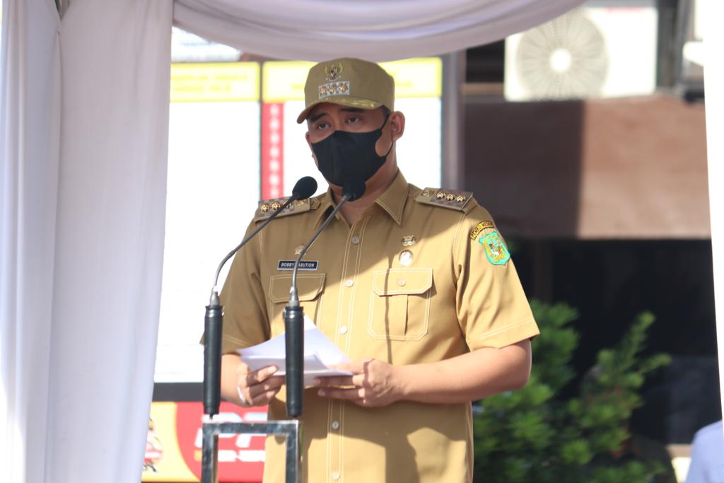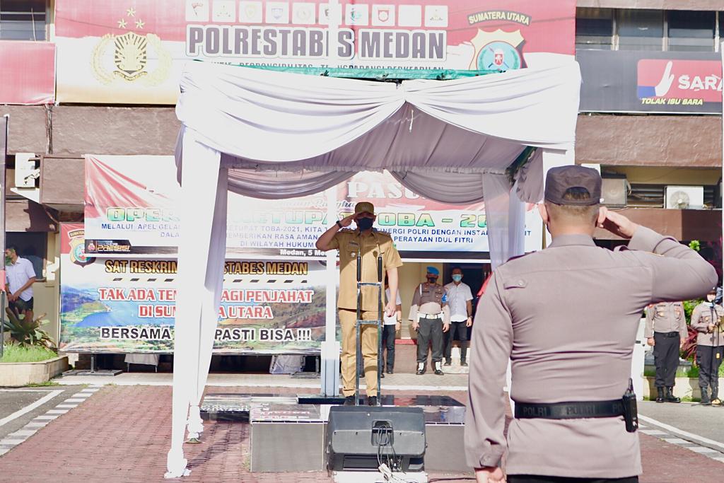 Wali Kota Medan, Muhammad Bobby Afif Nasution, S.E., M.M. memimpin Apel Gelar Pasukan Operasi Ketupat Toba Tahun 2021, Rabu (5/5) di Lapangan Apel Mapolrestabes Medan.