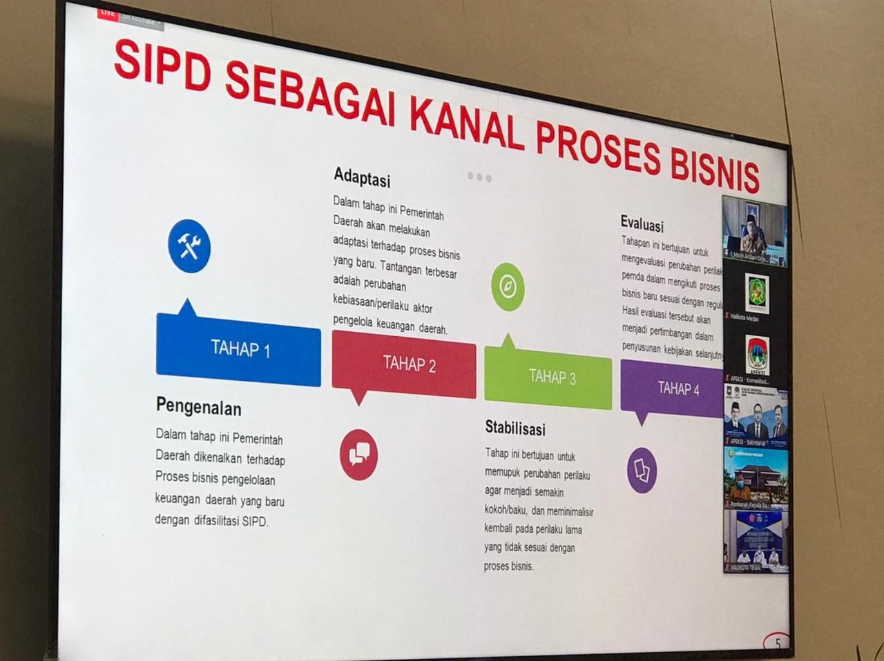 Dirjen Bina Keuangan Daerah Kemendagri, Dr H Mochamad Ardian Noervianto, juga bertindak sebagai pembicara dalam Dialog Nasional itu. Pada salah satu bagian pemaparan, dia merincikan 4 tahapan yang dilakukan dalam SIPD sebagai kanal proses bisnis. Tahapan pertama adalah pengenalan. Pada tahapan ini, jelasnya, Pemerintah Daerah dikenalkan terhadap proses bisnis pengelolaan keuangan daerah yang baru dengan difasilitasi SIPD. Tahap kedua, sebutnya, yakni adaptasi. Pada tahap tahap ini Pemerintah Daerah akan melakukan adaptasi terhadap proses bisnis yang baru.