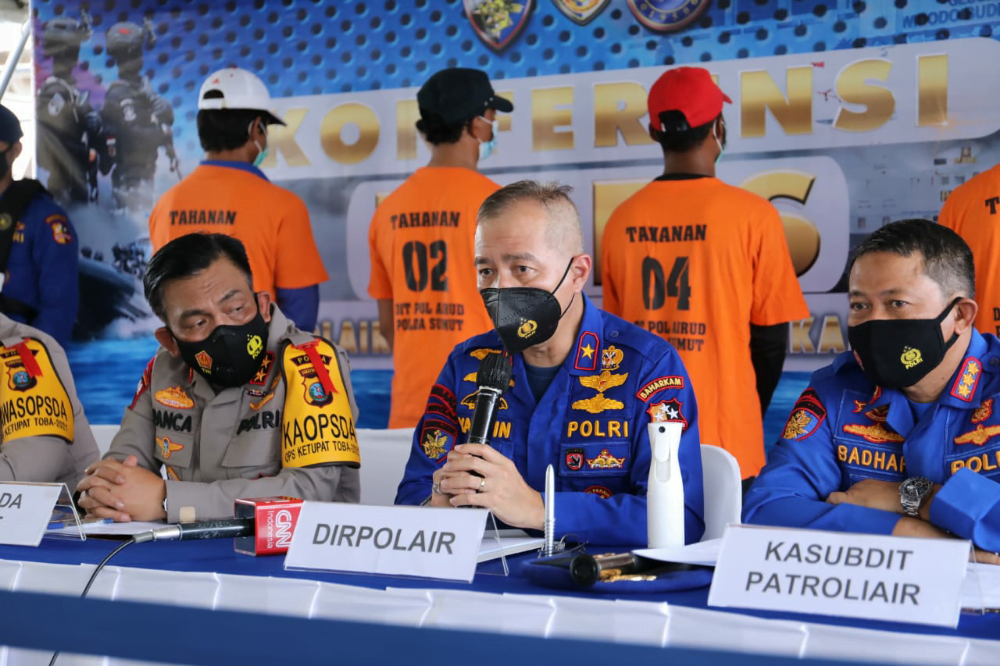 Lidikcyber,medan.Kapolda Sumut Irjen Pol RZ Panca Putra Simanjuntak bersama Dirpolair Korpolairud Baharkam Polri Brigjen Pol Yassin Kosasih, memimpin press rilis penangkapan kapal ikan asing di Selat Malaka.