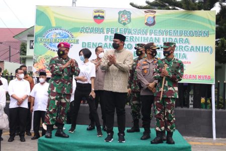 Wali Kota Medan, Muhammad Bobby Afif Nasution, S.E., M.M. melepas kegiatan penyemprotan penjernih udara dengan eco enzime, Kamis (13/5) di depan Markas Kodim 0201 BS.