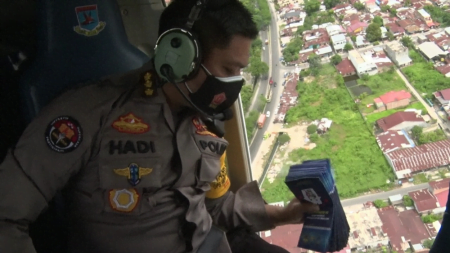 Kali ini dengan menggunakan helikopter, Kabid Humas Polda Sumut, Kombes Pol Hadi Wahyudi, menyebar sebanyak 5.000 brosur imbauan PPKM Darurat dari udara.