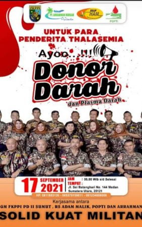 “Aksi donor darah personel GM FKPPI Sumut juga untuk para Penderita Thalasemia,” ujar Ketua Panitia Yan Surya Dharma yang juga Sekretaris GM FKPPI Sumut didampingi Wakil Ketua I GM FKPPI Sumut, Yan Karo Karo dan Biro Humas, Andi Mulia.