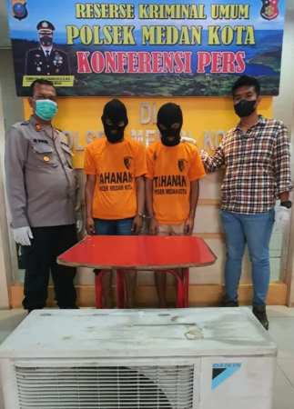 Kapolsek Medan Kota, Kompol Rikki Ramadhan didampingi, Kanit Reskrim, Iptu Asrul Rambe, kepada wartawan, Sabtu (30/10/2021) siang mengatakan, ke dua pelaku pencurian tersebut, ditangkap di Jalan Danau Singkarak, ketika mau menjual barang curian nya, berupa satu unit mesin AC Merk Daikin.