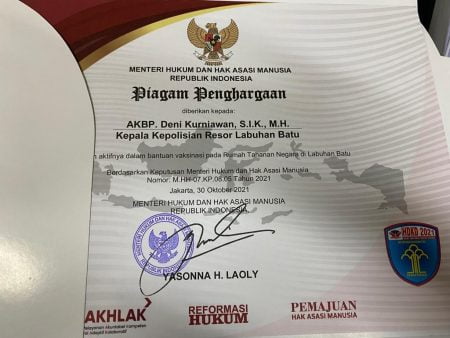 Lidikcyber,Labuhanbatu. – Aktif dalam membantu vaksinasi pada Rumah Tahanan Negara (Rutan), Kapolres Labuhanbatu, Sumatera Utara,  AKBP Deni Kurniawan SIK MH,  menerima piagam penghargaan dari Menteri Hukum dan Hak Asasi Manusia, Yasonna H. Laoly, Selasa (02/11/2021).