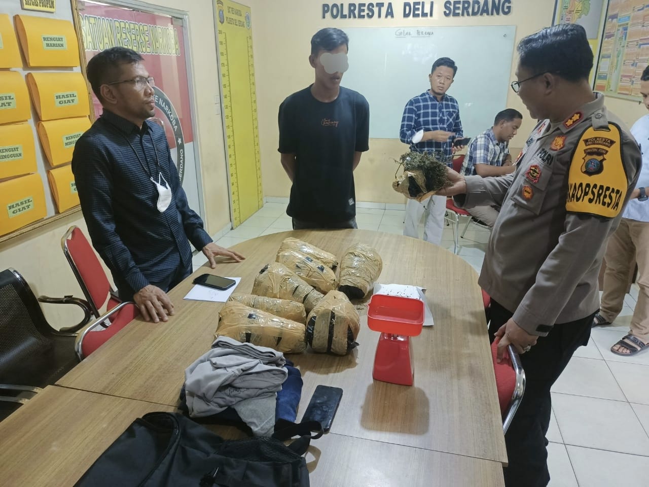 Kapolresta Deli Serdang Kombes Pol Irsan Sinuhaji, SIK, MH melalui Kasat Narkoba Kompol Zulkarnain, SH menerangkan penangkapan tersebut di Jln.lintas sumatera utara Lubuk Pakam-Tebing tinggi Kec.Lubuk pakam Kab.Deliserdang dengan tersangka berinisial MR (19) warga Kec.Peulimbang Kab.Bireun Provinsi Aceh.