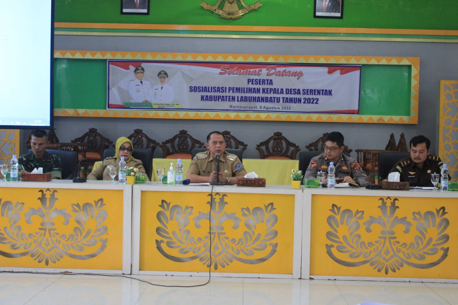 Permintaan tersebut disampaikan langsung oleh Bupati yang didampingi Wakil Bupati Hj.Ellya Rosa Siregar,S.Pd.MM saat memimpin rapat sosialisasi pemilihan Kepala Desa serentak tahun 2022 di Ruang Data dan Karya, Kantor Bupati, Kecamatan Rantau Selatan, Senin (08/08/2022).
