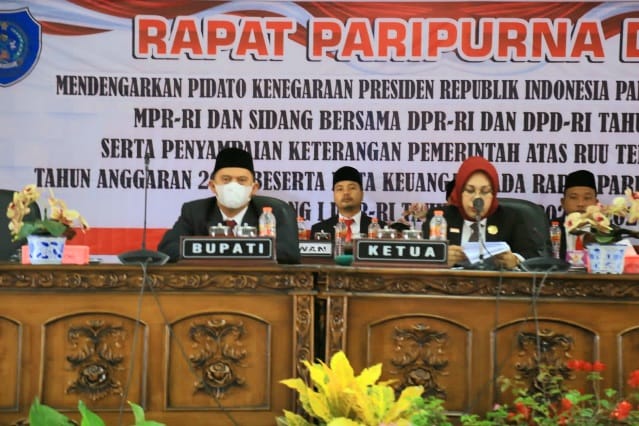 Bupati Labuhanbatu dr. H. Erik Adtrada Ritonga MKM ikut mendengarkan Pidato Kenegaraan Presiden Republik Indonesia pada Sidang Tahunan MPR RI dan Sidang Bersama DPR RI dan DPD RI Tahun 2022, dalam agenda Paripurna DPRD Kabupaten Labuhanbatu di Ruang Rapat Paripurna DPRD, Selasa (16/08/2022).