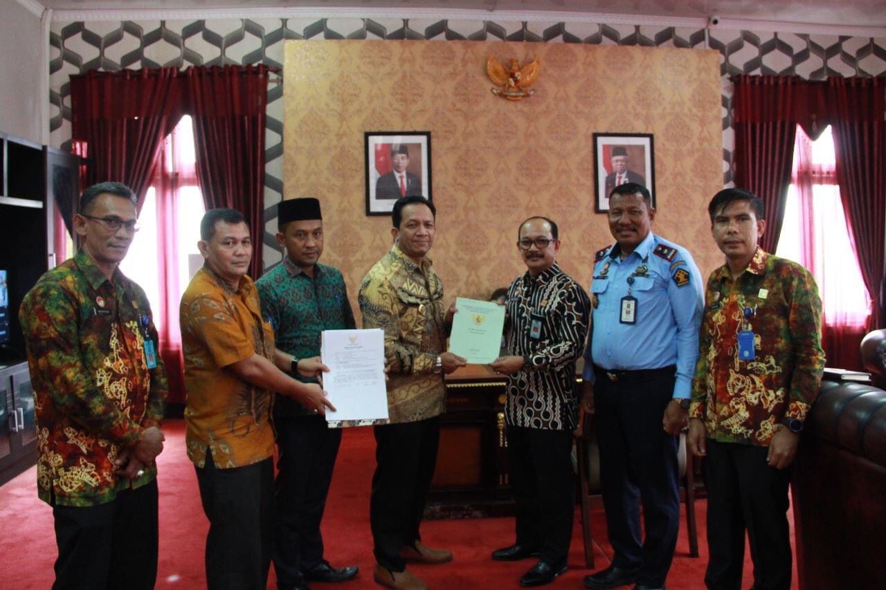 Sertifikat tanah tersebut diserahkan langsung oleh Pj Bupati Bireuen, Aulia Sofyan kepada Kepala Kantor Wilayah Kemenkumham Aceh, Meurah Budiman.