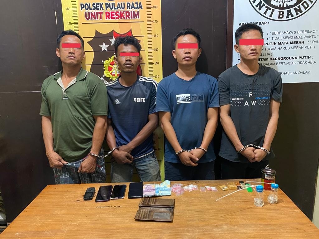 Lidikcyber.com, Asahan – Tim opsnal Satreskrim Polsek Pulau Raja menggerebek sebuah gubuk sebagai tempat transaksi dan konsumsi sabu dan berhasil menangkap M.Reno (38), Keman Dwi Chayanto (31), Hari Akbar alias Lelek (30) dan Ragil Purmono (36) mereka merupakan warga Dusun III Desa Padang Mahondang Kecamatan Pulau Rakyat Kabupaten Asahan.