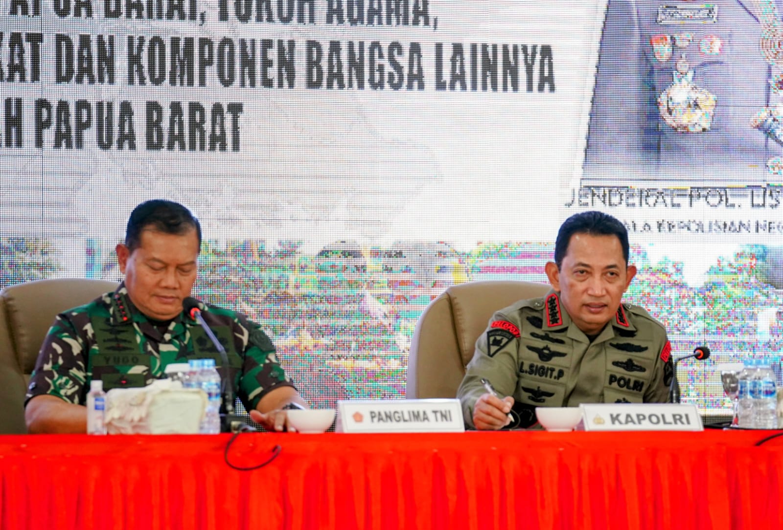“Kami dengan Pak Panglima dan Kepala Staf dari beberapa hari lalu berkeliling di wilayah Papua dan hari ini kami masuk ke wilayah Papua Barat. Tentunya maksud kami, Panglima, Kapolri dan Kepala Staf Angkatan bersama-sama didampingi para pejabat utama baik Mabes TNI, AD, AL, AU dan Mabes Polri tak lain, tak bukan hanya untuk menunjukan bahwa yang namanya TNI dan Polri solid,” kata Sigit disambut tepuk tangan meriah warga.