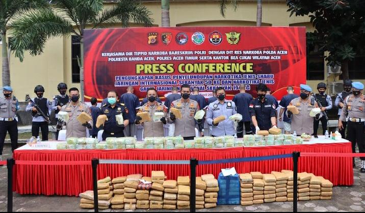 Banda Aceh – Tim gabungan yang terdiri dari Dir Reserse Narkoba Polda Aceh, Tippid Narkoba Bareskrim Polri, Polresta Banda Aceh, Polres Aceh Timur dan Bea Cukai Aceh berhasil mengungkap kasus peredaran gelap narkoba. Kapolda Aceh, Irjen. Pol. Wahyu Widada dalam keterangan persnya, Rabu 7 April 2021 mengatakan ada narkotika jenis sabu seberat 50 Kg dan Ganja seberat 194 Kg yang dibekuk aparat gabungan. “Untuk kasus sabu, mereka merupakan sindikat dari jaringan internasional sementara untuk ganja jaringan nasional,” kata Wahyu Widada di Mapolda Aceh didampingi Dirresnarkoba Polda Aceh Kombes Pol. Ade Sapari, Kakanwil Bea Cukai Aceh, Pejabat Dittipid Narkoba Bareskrim Polri.