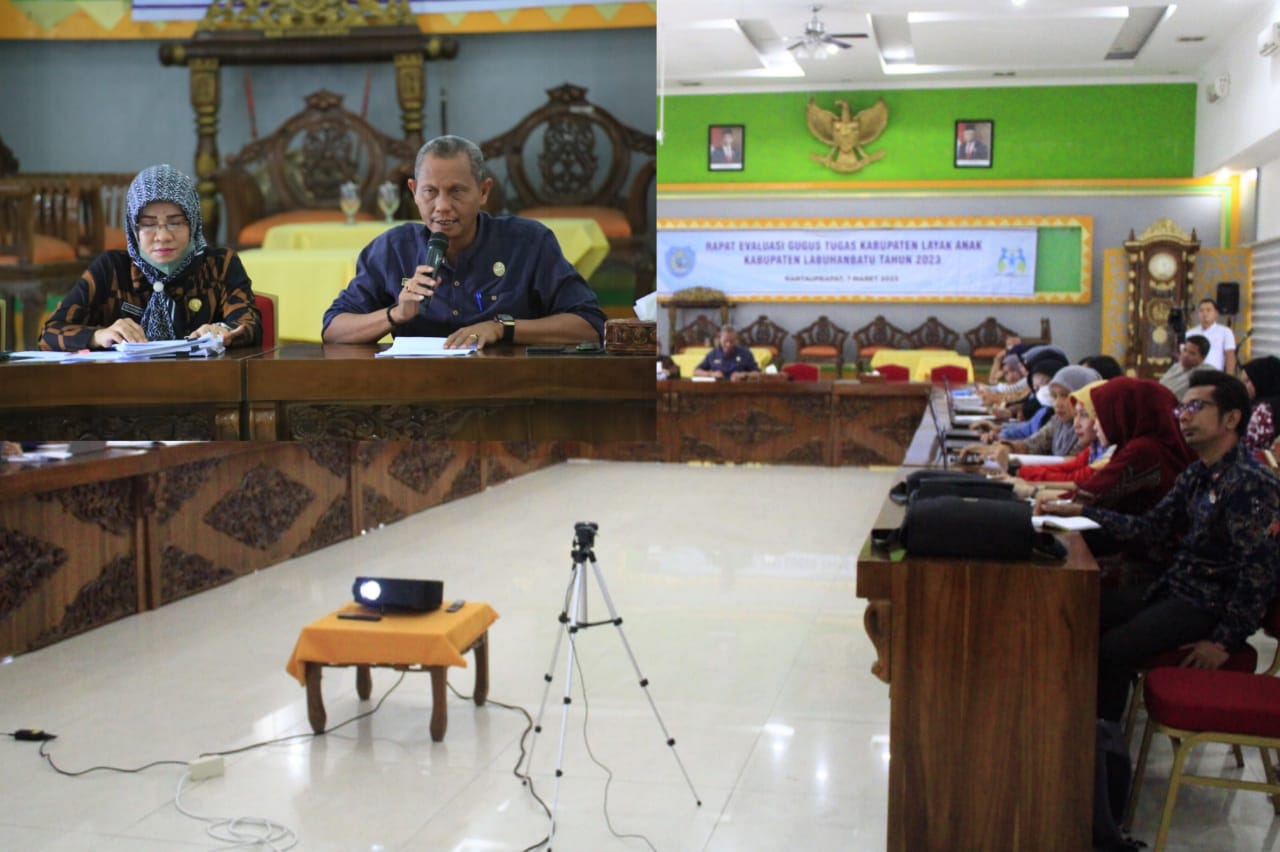Bupati Labuhanbatu dr. H. Erik Adtrada Ritonga, M.KM yang diwakili Asisten I Pemerintahan dan Kesra Kabupaten Labuhanbatu Drs. H. Sarimpunan Ritonga, M.Pd didampingi Kepala Dinas Pemberdayaan Perempuan dan Perlindungan Anak Kabupaten Labuhanbatu Hj. Tuti Noprida Ritonga S.Si, Apt MM., membuka rapat evaluasi pengisian data indikator Kabupaten Layak Anak (KLA) Tahun 2023 di Ruang Data dan Karya Kantor Bupati Labuhanbatu, Kecamatan Rantau Selatan, Jumat (24/03/2023).