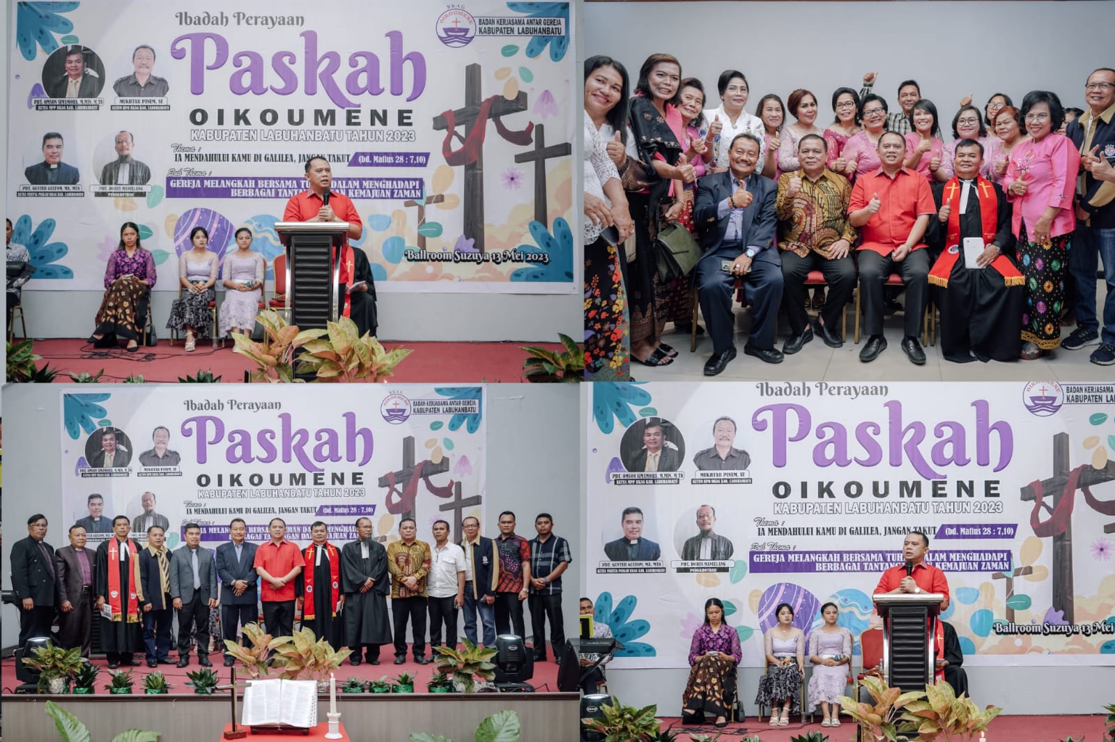 Bupati Labuhanbatu, dr.H.Erik Adtrada Ritonga,MKM turut hadir pada perayaan paskah oikoumene Badan Kerjasama Antar Gereja (BKAG) Kabupaten Labuhanbatu tahun 2023, di Ballroom Suzuya Hotel, Rantauprapat, Kecamatan Rantau Utara, Sabtu (13/05/2023).