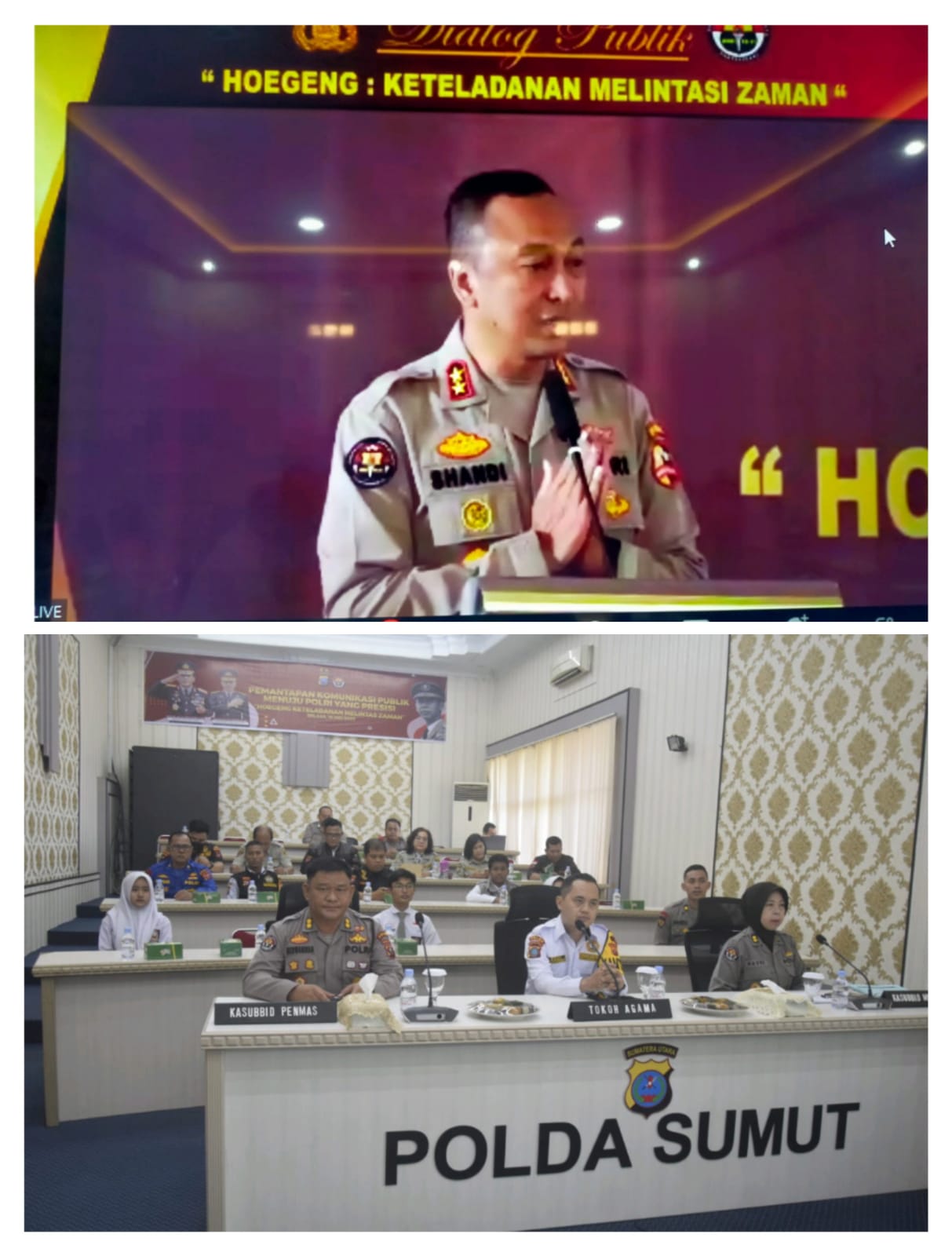 Lidikcyber.com, Medan – Kepala Kepolisian Daerah Sumatera Utara dalam hal ini diwakili Kasubid Penmas Bid Humas Polda Sumut AKBP Dr Herwansyah,S.H.,M.Si dan Kasubdit Multimedia AKBP Navri Y,S.H.,M.H. mengikuti kegiatan Dialog Publik dengan tema Hoegeng : Keteladanan Melintasi Zaman secara virtual dengan Mabes Polri, Selasa (16/05/2023) pukul 10.30 wib.