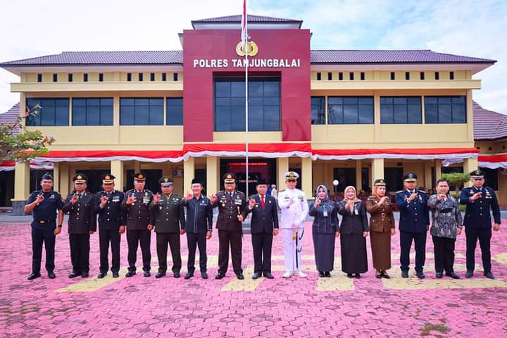 Walikota Tanjungbalai H Waris Tholib bersama seluruh jajaran Forkopimda mengikuti upacara dan menghadiri acara syukuran hari Bhayangkara ke-77 tahun 2023 di Lapangan dan Gedung SAR Polres Tanjungbalai, Sabtu (1/7/2023) pagi.