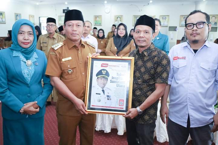 Tim Litbang Times Indonesia Imam Fauzi dan Perwakilan Koordinator Biro Media Online Times Indonesia Rudi Mulya menyerahkan penghargaan tersebut kepada Waris saat pelaksanaan Apel Pagi di Lapangan Kantor Walikota, Senin (10/7/2023).