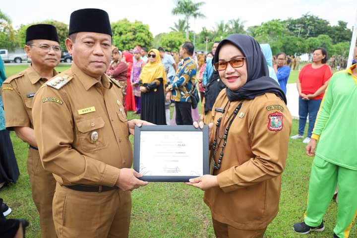 Walikota Tanjungbalai H Waris Tholib menyerahkan penghargaan atas prestasi yang diraih kota Tanjungbalai dalam pelaksanaan Apel Gabungan, di Lapangan Kantor Walikota, Senin (4/9/2023) pagi.