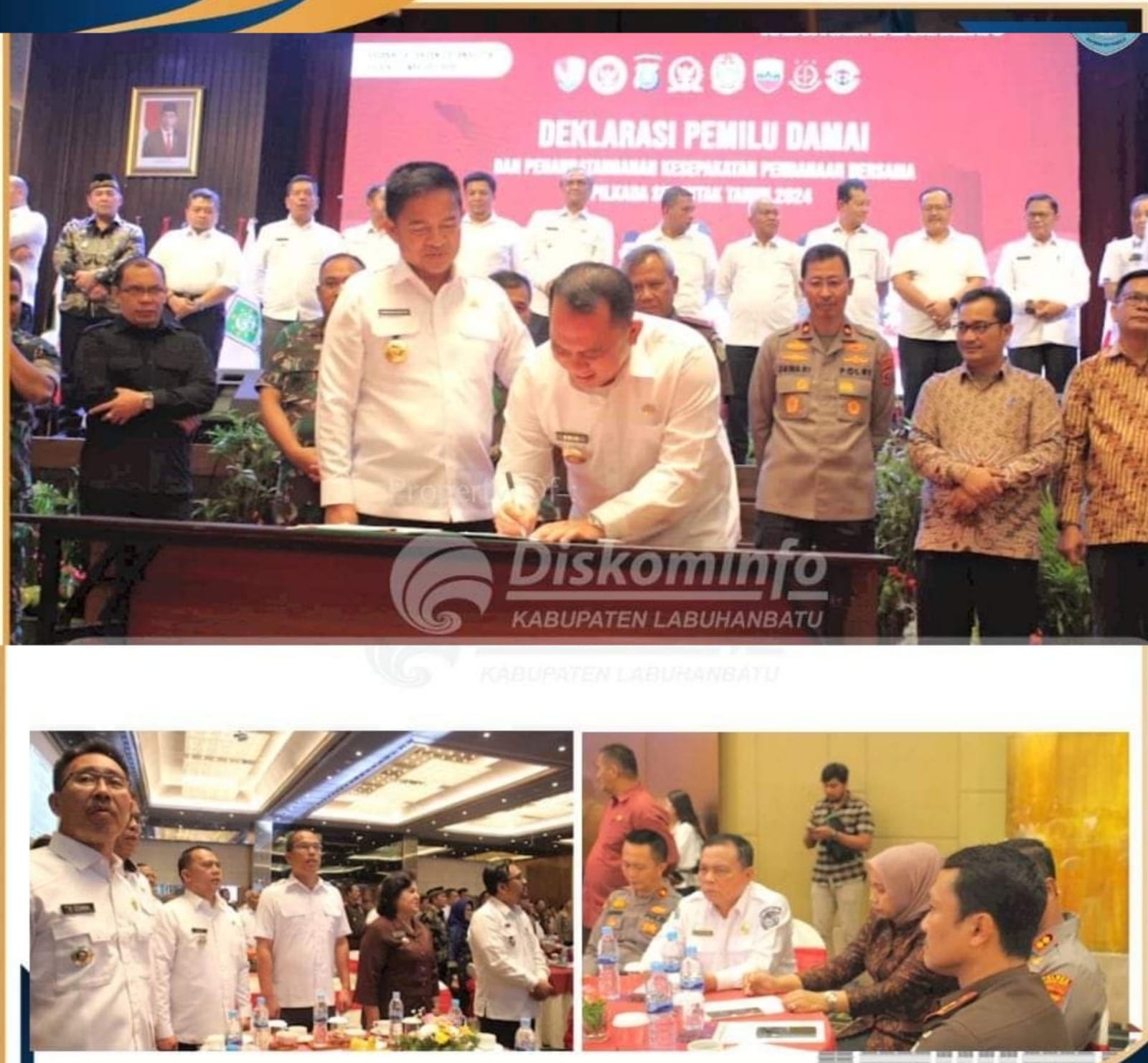 Turut hadir mendampingi Bupati Labuhanbatu dalam pernyataan deklarasi damai tersebut, para pimpinan Forkopimda Labuhanbatu, Kaban BKAD Salman Alfarisi, Kaban Kesbangpol Nilwan SE, dan Kabag protokol Prandi A. Nasution.(icL)