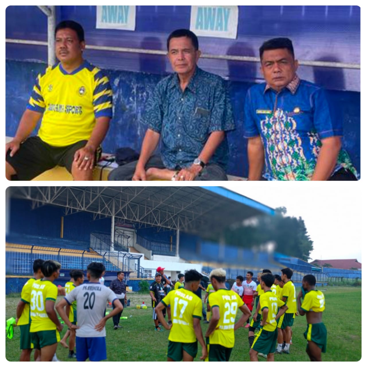 Manager Poslab Halomoan SH (tengah ) bersama Ketua Umum Poslab Labuhanbatu Asrol Aziz Lubis SE MAP di Bens Lapangan Stadion binaraga, Senin (16/10/2023).