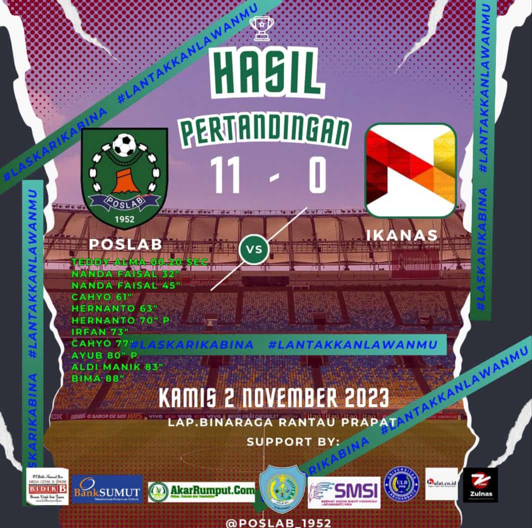 Berhadapan Ikanas di Stadion Binaraga Rantauprapat Kelurahan Binaraga Kecamatan Rantau Utara, Kamis sore (02/11/2023) tim Laskar Ika Bina Julukan dari Poslab Labuhanbatu berhasil menang telak 11-0.