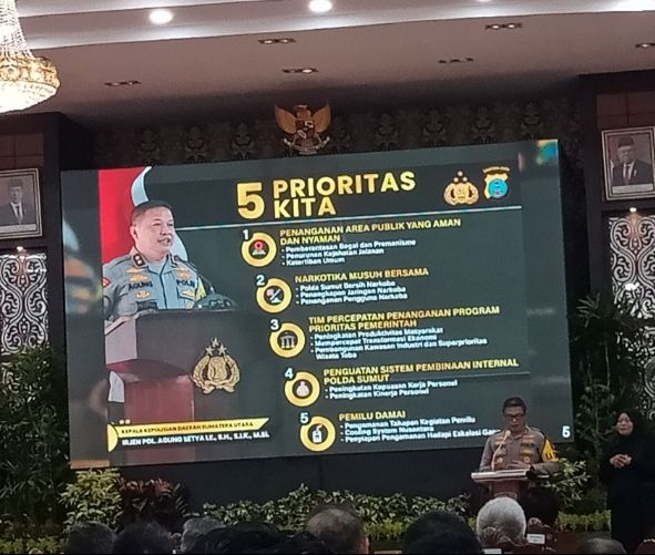 ” Selain itu, prioritas lainya yaitu Pemilu damai. Pemilu sudah diambang pintu, baik pilpres, pileg dan pilkada, sehingga diperlukan keseriusan setiap jajaran dalam pengamanan” ujar Kapoldasu.