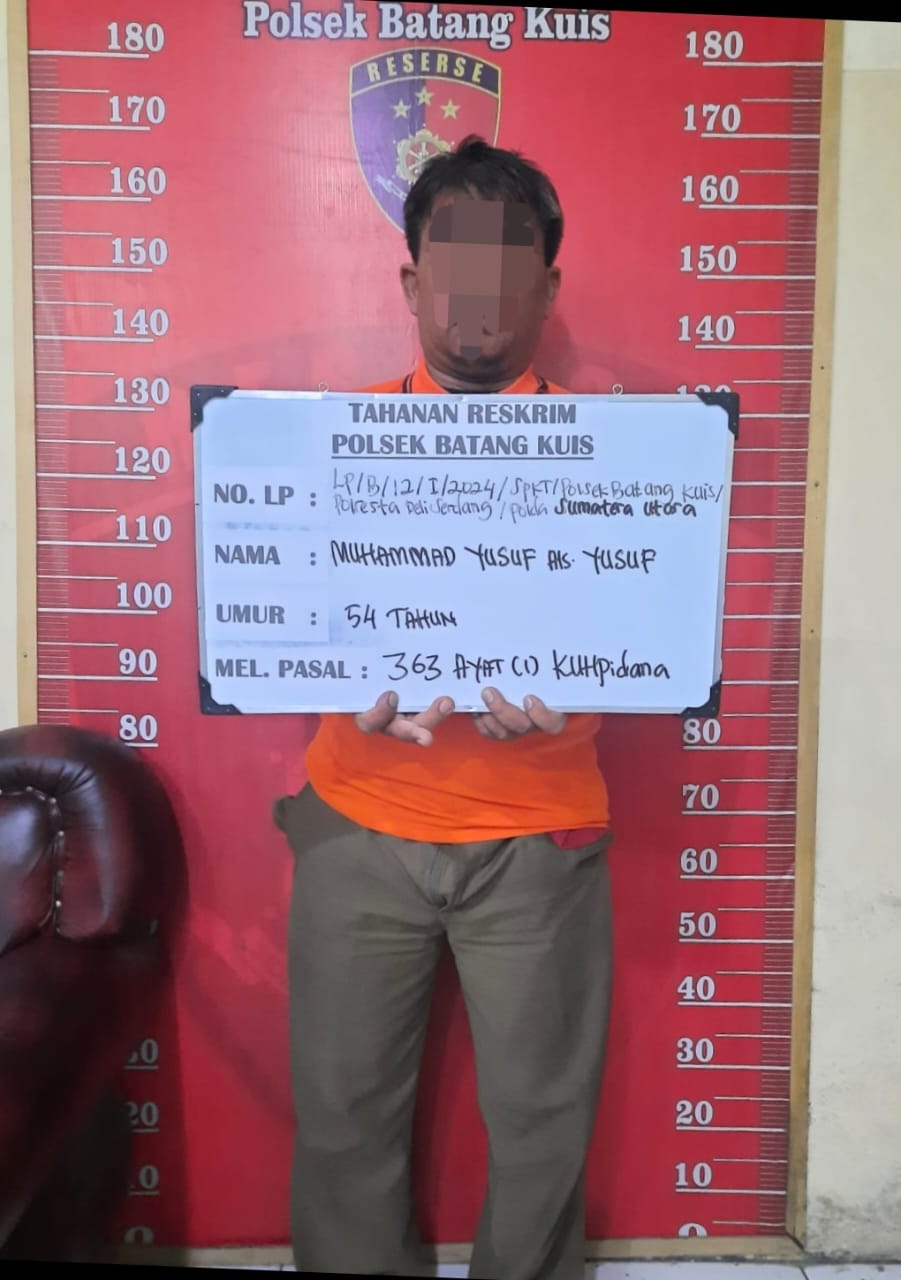 Tak butuh waktu lama, Tim unit Reskrim Polsek Batang Kuis melakukan penyelidikan dalam kasus pencurian tersebut dan dari hasil penyelidikan didapat informasi bahwa pelaku MY (55) berada dirumah menantunya di Jl. pimpinan Dusun II Desa Bintang Meriah Kecamatan Batang Kuis Kabupaten Deli Serdang, tim langsung menuju ke lokasi dan berhasil mengamankan pelaku beserta satu unit seoeda Motor Honda Vario warna hitam kendaraan yang digunakan pelaku bersama temannya ( DPO ), Selanjut nya tim Membawa pelaku beserta barang bukti ke polsek Batang Kuis guna dimintai keterangan lebih lanjut.