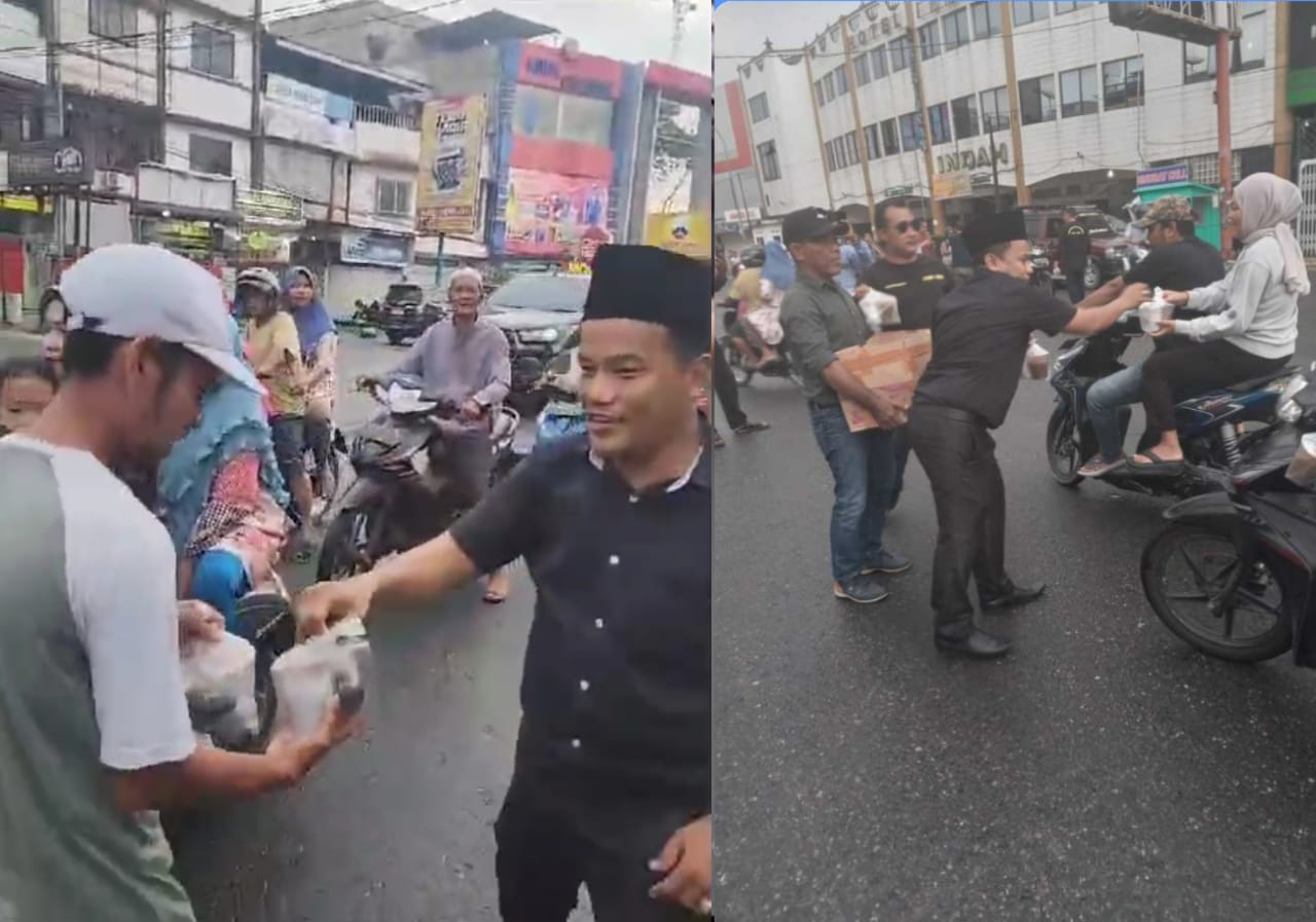 Dirut PT.Marluga Jaya Lestari, Berry Lumban Gaol dan sejumlah jurnalis portal Berbagi takjil Secara gratis kepada para pengguna jalan di Kota Rantauprapat, Kabupaten labuhanbatu Sumatera Utara, jumat (29/03/2024).