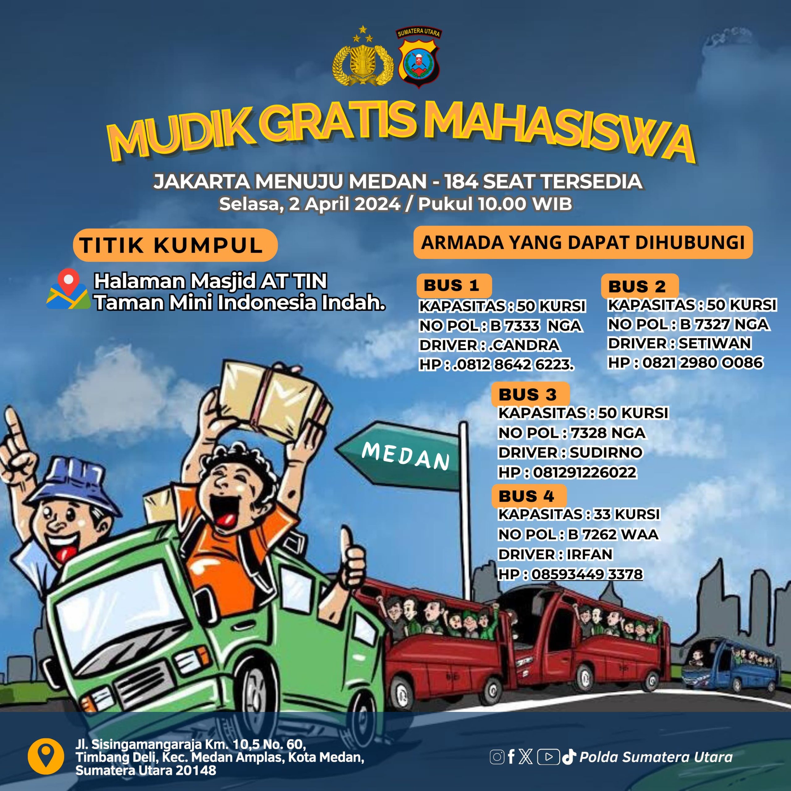 “Mudik gratis yang digelar ini sebagai bentuk perhatian Polda Sumut kepada adik-adik mahasiswa yang menimba ilmu di Jakarta, sekitarnya,” ujar Hadi.