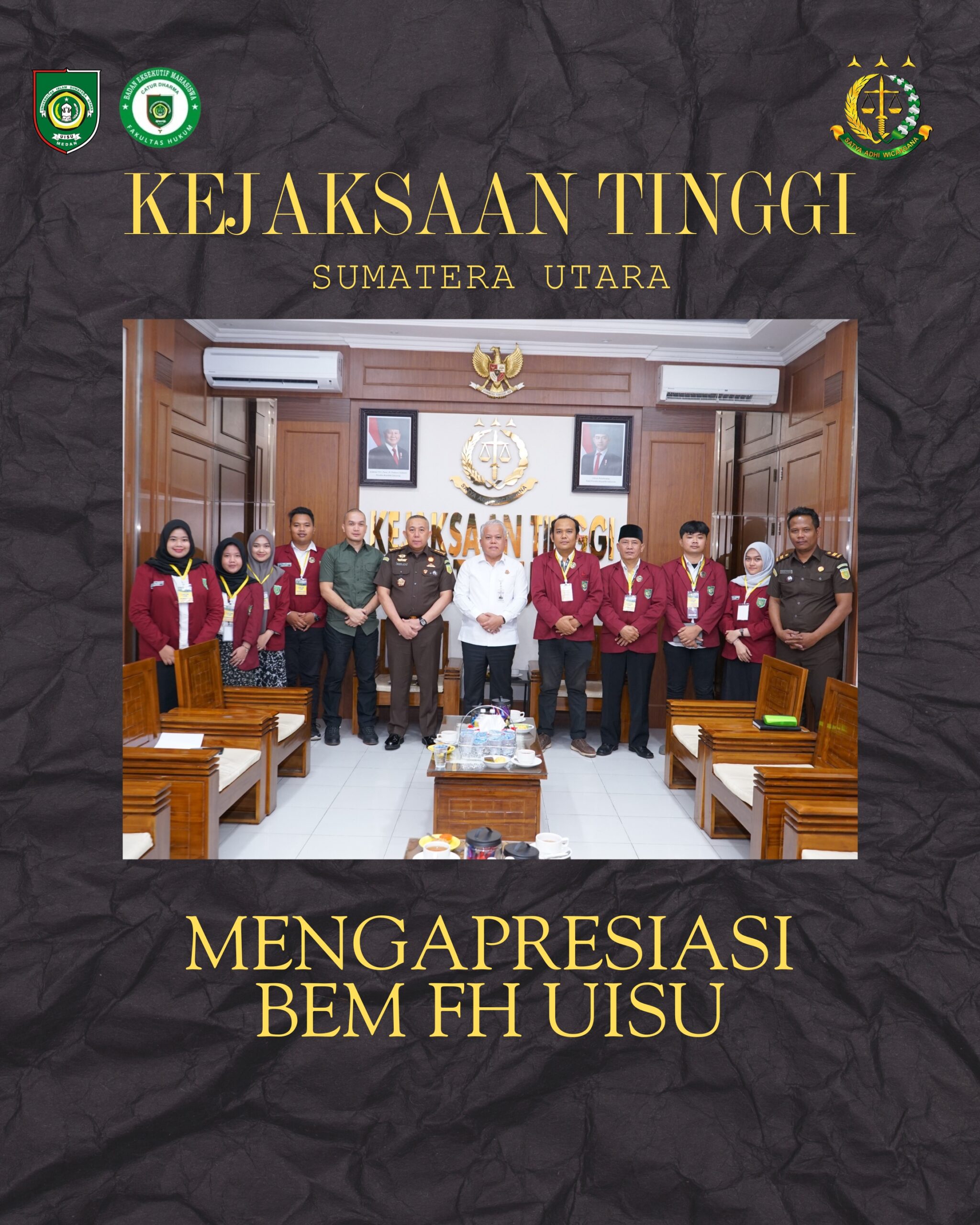 “Kejaksaan Tinggi Sumatera Utara mengapresiasi dukungan yang diberikan oleh BEM Fakultas Hukum UISU. Dalam penanganan tindak pidana korupsi, Kejaksaan tetap mengedepankan asas praduga tak bersalah. Setiap masukan dan informasi yang disampaikan akan ditindaklanjuti melalui Kepala Bidang Tindak Pidana Khusus untuk menelaah dugaan tindak pidana korupsi yang terjadi di wilayah Provinsi Sumatera Utara,” ungkapnya.