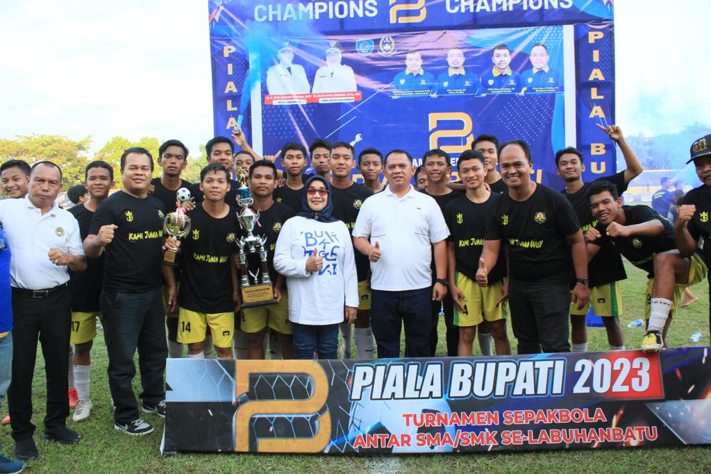 Bupati Labuhanbatu dr.H.Erik Adtrada Ritonga, MKM, didampingi Asisten I Pemerintahan dan Kesra Sekdakab Labuhanbatu Drs.H. Sarimpunan Ritonga,M.Pd, hadir menyaksikan Grand Final Sepakbola Bupati Cup antar SMA tahun 2023 di stadion Binaraga Rantauprapat Kecamatan Rantau Utara Kamis 16/2/2023.